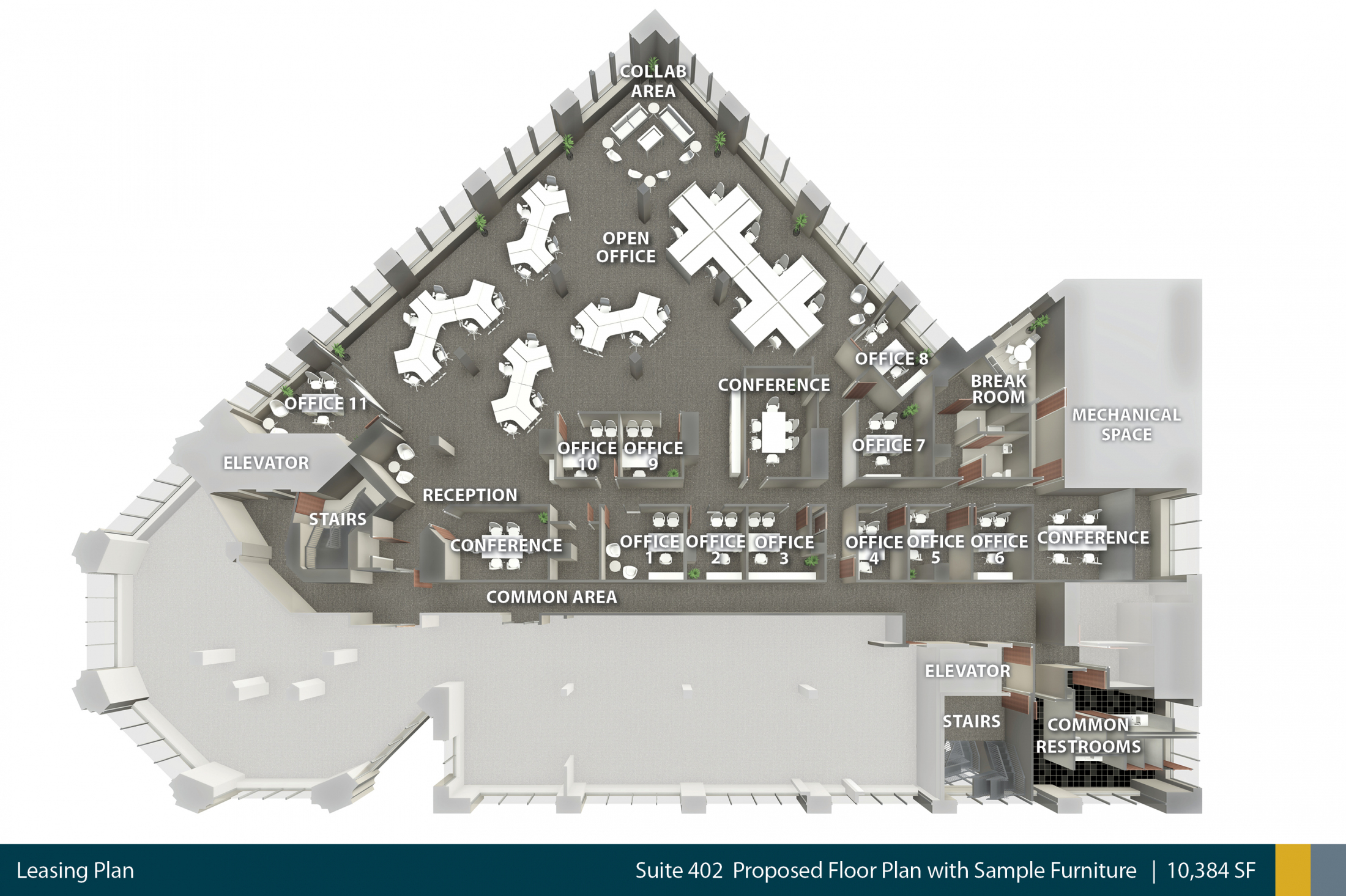 - Adaptive floor plan for open office or traditional office concept.